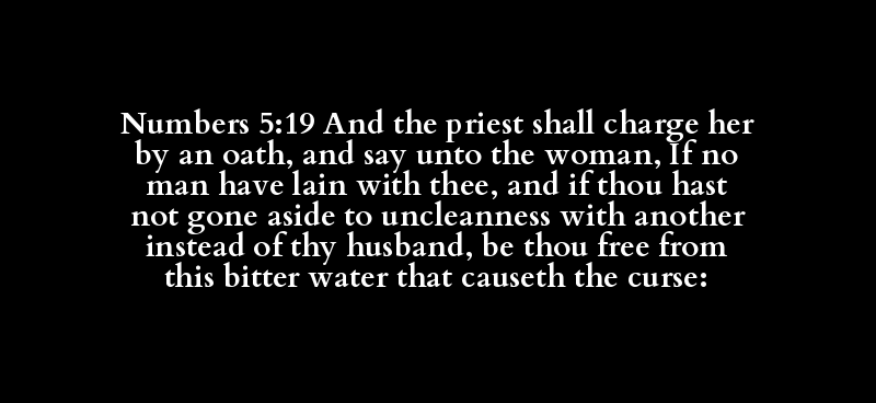 Numbers 5:19 And the priest shall charge her by an oath, and say unto the woman, If no man have lain with thee, and if thou hast not gone aside to uncleanness with another instead of thy husband, be thou free from this bitter water that causeth the curse: