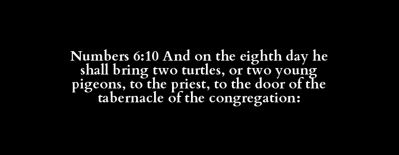 Numbers 6:10 And on the eighth day he shall bring two turtles, or two young pigeons, to the priest, to the door of the tabernacle of the congregation: