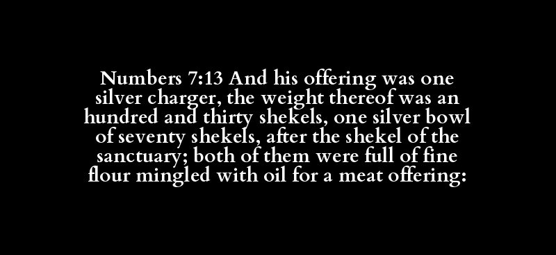 | [qorban] | ['echad] | [keceph] | [q`arah] | [mishqal] | [me'ah] | [shlowshiym] | ['echad] | [keceph] | [mizraq] | [shib`iym.] | [sheqel] | [sheqel] | [qodesh] | [shnayim] | [male'] | [coleth] | [balal] | [shemen] | [minchah] |