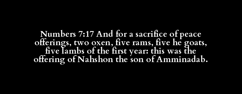 Numbers 7:17 And for a sacrifice of peace offerings, two oxen, five rams, five he goats, five lambs of the first year: this was the offering of Nahshon the son of Amminadab.