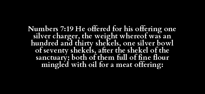 Numbers 7:19 He offered for his offering one silver charger, the weight whereof was an hundred and thirty shekels, one silver bowl of seventy shekels, after the shekel of the sanctuary; both of them full of fine flour mingled with oil for a meat offering: