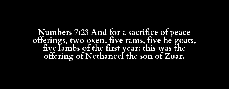 Numbers 7:23 And for a sacrifice of peace offerings, two oxen, five rams, five he goats, five lambs of the first year: this was the offering of Nethaneel the son of Zuar.