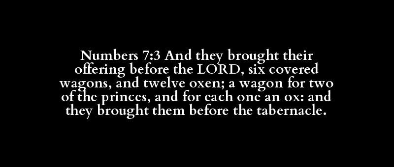 Numbers 7:3 And they brought their offering before the LORD, six covered wagons, and twelve oxen; a wagon for two of the princes, and for each one an ox: and they brought them before the tabernacle.
