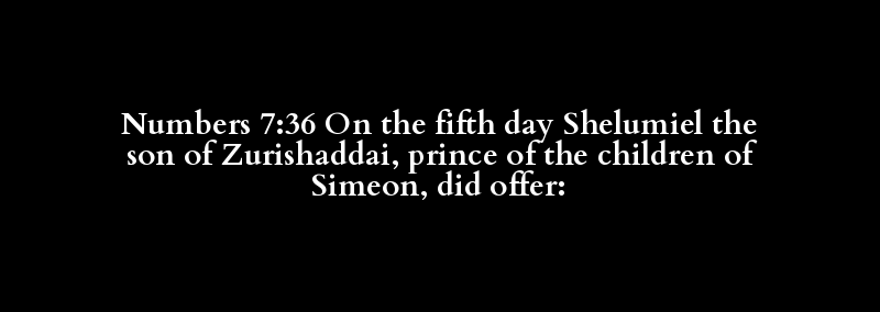 Numbers 7:36 On the fifth day Shelumiel the son of Zurishaddai, prince of the children of Simeon, did offer: