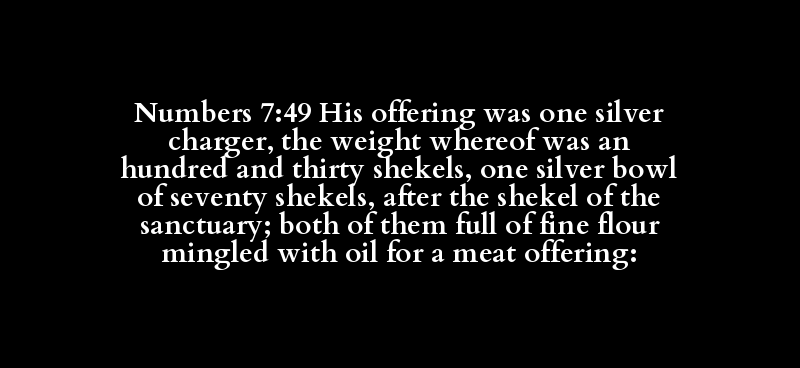 Numbers 7:49 His offering was one silver charger, the weight whereof was an hundred and thirty shekels, one silver bowl of seventy shekels, after the shekel of the sanctuary; both of them full of fine flour mingled with oil for a meat offering: