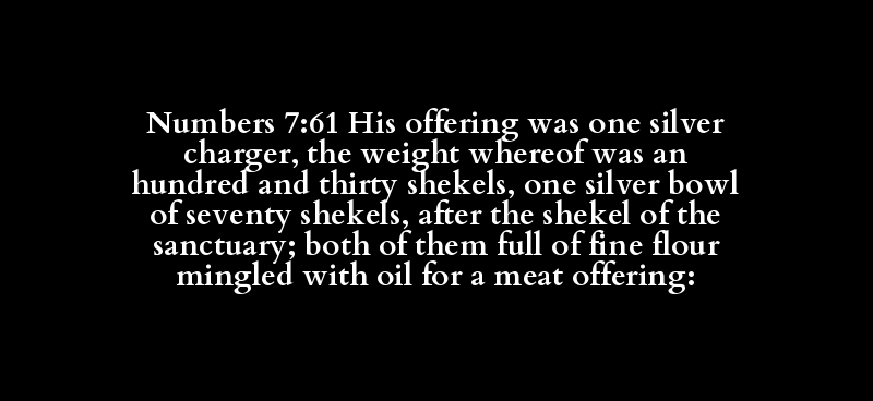 Numbers 7:61 His offering was one silver charger, the weight whereof was an hundred and thirty shekels, one silver bowl of seventy shekels, after the shekel of the sanctuary; both of them full of fine flour mingled with oil for a meat offering: