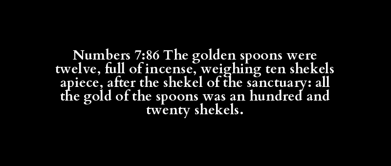 | זָהָב | כַּף | שְׁנַיִם | עָשָׂר | מָלֵא | קְטֹרֶת | עֶשֶׂר | כַּף | שֶׁקֶל | קֹדֶשׁ | זָהָב | כַּף | מֵאָה | עֶשְׂרִים |
