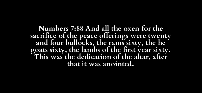 Numbers 7:88 And all the oxen for the sacrifice of the peace offerings were twenty and four bullocks, the rams sixty, the he goats sixty, the lambs of the first year sixty. This was the dedication of the altar, after that it was anointed.