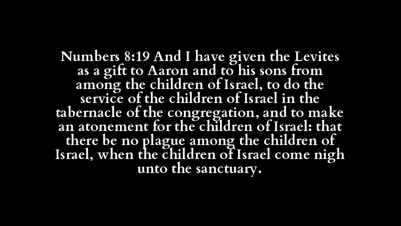 Numbers 8:19 And I have given the Levites as a gift to Aaron and to his sons from among the children of Israel, to do the service of the children of Israel in the tabernacle of the congregation, and to make an atonement for the children of Israel: that there be no plague among the children of Israel, when the children of Israel come nigh unto the sanctuary.