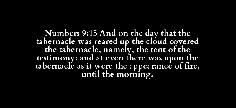 Numbers 9:15 And on the day that the tabernacle was reared up the cloud covered the tabernacle, namely, the tent of the testimony: and at even there was upon the tabernacle as it were the appearance of fire, until the morning.