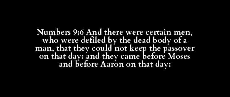 Numbers 9:6 And there were certain men, who were defiled by the dead body of a man, that they could not keep the passover on that day: and they came before Moses and before Aaron on that day: