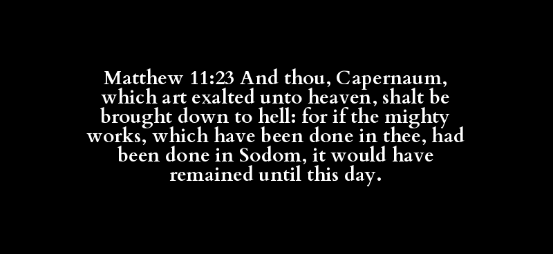Matthew 11:23 And thou, Capernaum, which art exalted unto heaven, shalt be brought down to hell: for if the mighty works, which have been done in thee, had been done in Sodom, it would have remained until this day.