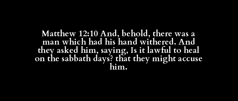Matthew 12:10 And, behold, there was a man which had his hand withered. And they asked him, saying, Is it lawful to heal on the sabbath days? that they might accuse him.