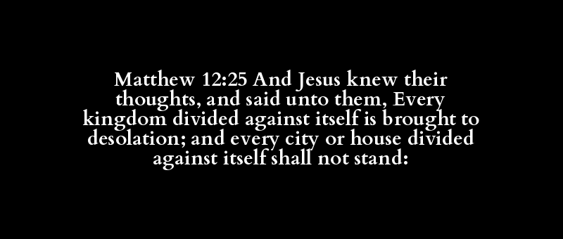 Matthew 12:25 And Jesus knew their thoughts, and said unto them, Every kingdom divided against itself is brought to desolation; and every city or house divided against itself shall not stand: