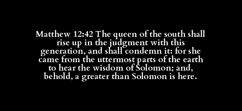 Matthew 12:42 The queen of the south shall rise up in the judgment with this generation, and shall condemn it: for she came from the uttermost parts of the earth to hear the wisdom of Solomon; and, behold, a greater than Solomon is here.