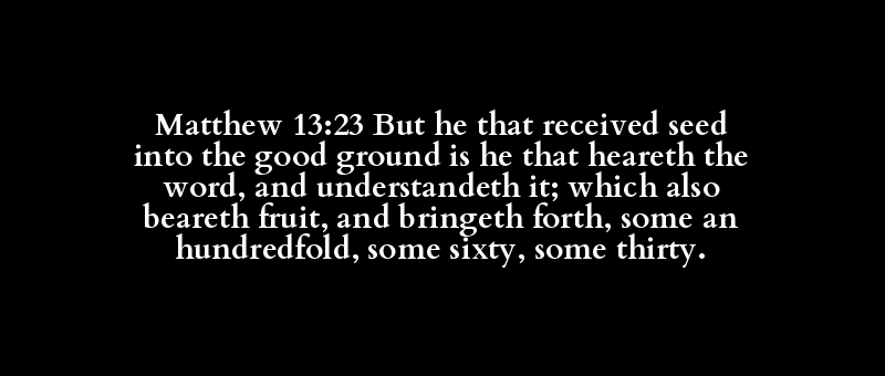 Matthew 13:23 But he that received seed into the good ground is he that heareth the word, and understandeth it; which also beareth fruit, and bringeth forth, some an hundredfold, some sixty, some thirty.