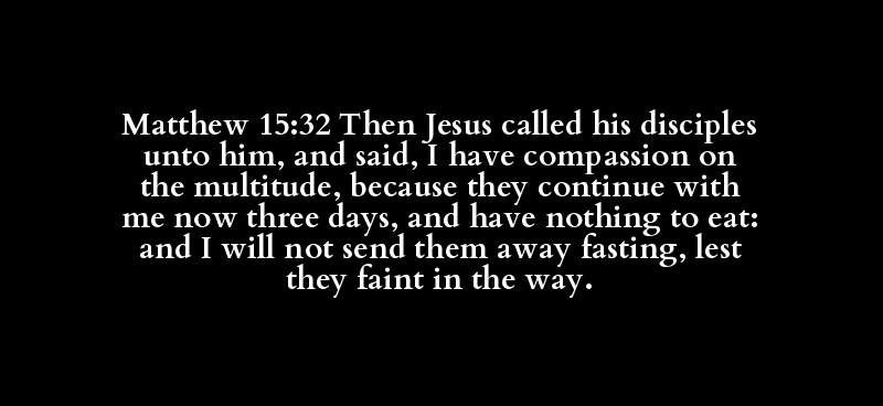 Matthew 15:32 Then Jesus called his disciples unto him, and said, I have compassion on the multitude, because they continue with me now three days, and have nothing to eat: and I will not send them away fasting, lest they faint in the way.