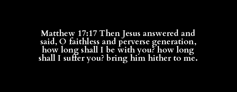 Matthew 17:17 Then Jesus answered and said, O faithless and perverse generation, how long shall I be with you? how long shall I suffer you? bring him hither to me.