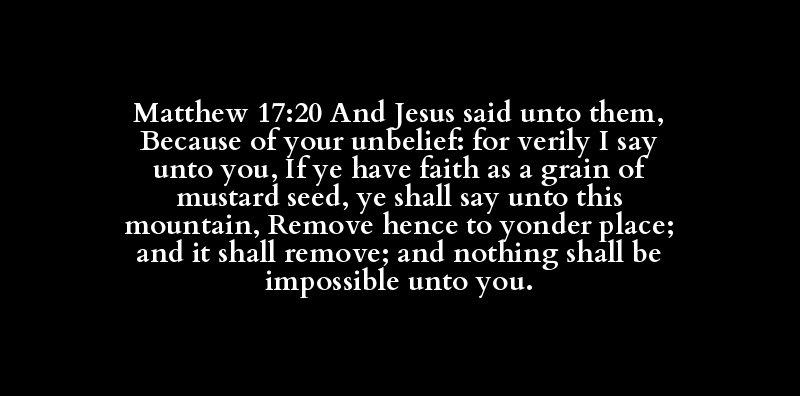 Matthew 17:20 And Jesus said unto them, Because of your unbelief: for verily I say unto you, If ye have faith as a grain of mustard seed, ye shall say unto this mountain, Remove hence to yonder place; and it shall remove; and nothing shall be impossible unto you.