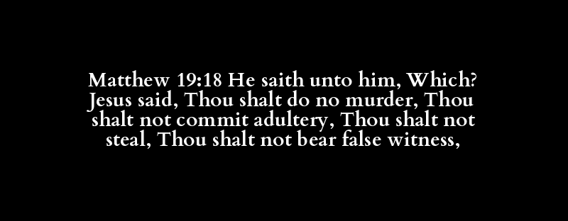 Matthew 19:18 He saith unto him, Which? Jesus said, Thou shalt do no murder, Thou shalt not commit adultery, Thou shalt not steal, Thou shalt not bear false witness,