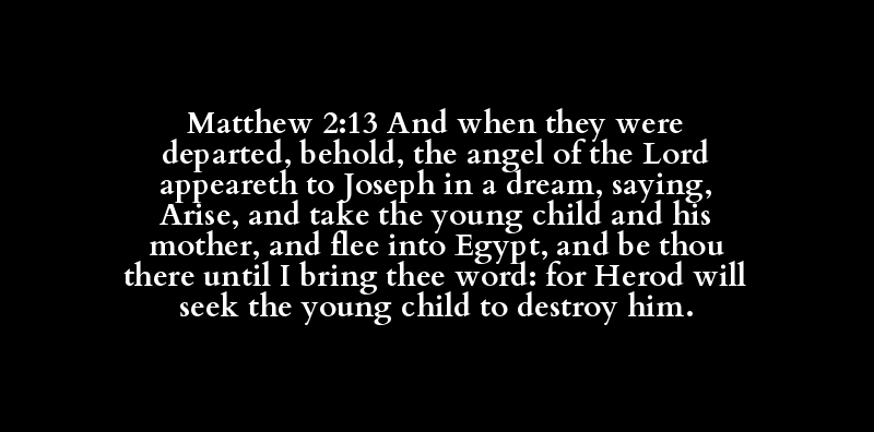 Matthew 2:13 And when they were departed, behold, the angel of the Lord appeareth to Joseph in a dream, saying, Arise, and take the young child and his mother, and flee into Egypt, and be thou there until I bring thee word: for Herod will seek the young child to destroy him.