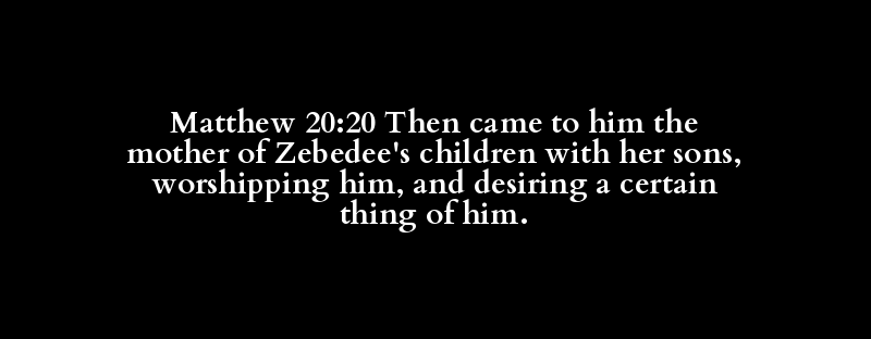 Matthew 20:20 Then came to him the mother of Zebedee's children with her sons, worshipping him, and desiring a certain thing of him.
