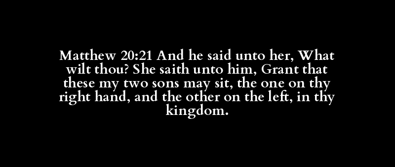 Matthew 20:21 And he said unto her, What wilt thou? She saith unto him, Grant that these my two sons may sit, the one on thy right hand, and the other on the left, in thy kingdom.