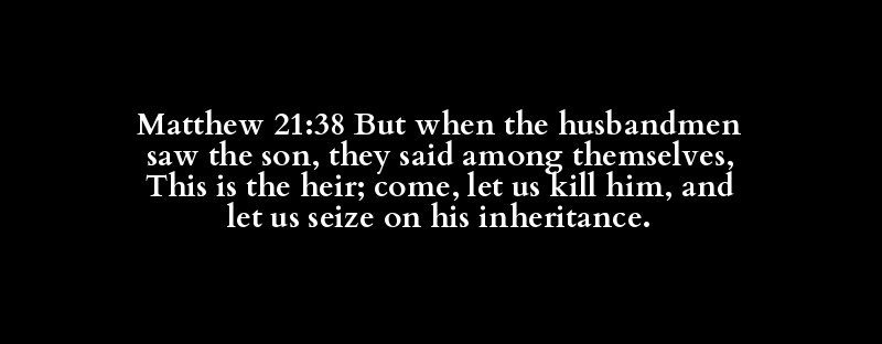 Matthew 21:38 But when the husbandmen saw the son, they said among themselves, This is the heir; come, let us kill him, and let us seize on his inheritance.