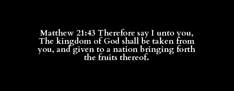 Matthew 21:43 Therefore say I unto you, The kingdom of God shall be taken from you, and given to a nation bringing forth the fruits thereof.