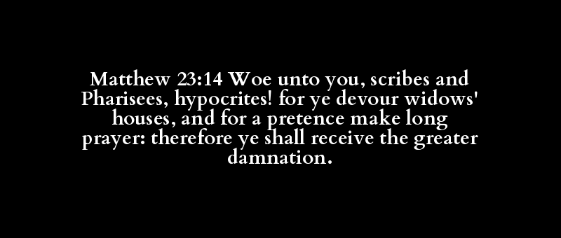Matthew 23:14 Woe unto you, scribes and Pharisees, hypocrites! for ye devour widows' houses, and for a pretence make long prayer: therefore ye shall receive the greater damnation.