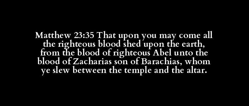 Matthew 23:35 That upon you may come all the righteous blood shed upon the earth, from the blood of righteous Abel unto the blood of Zacharias son of Barachias, whom ye slew between the temple and the altar.