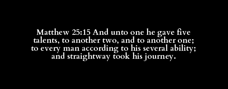 Matthew 25:15 And unto one he gave five talents, to another two, and to another one; to every man according to his several ability; and straightway took his journey.