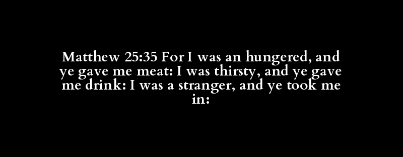 Matthew 25:35 For I was an hungered, and ye gave me meat: I was thirsty, and ye gave me drink: I was a stranger, and ye took me in: