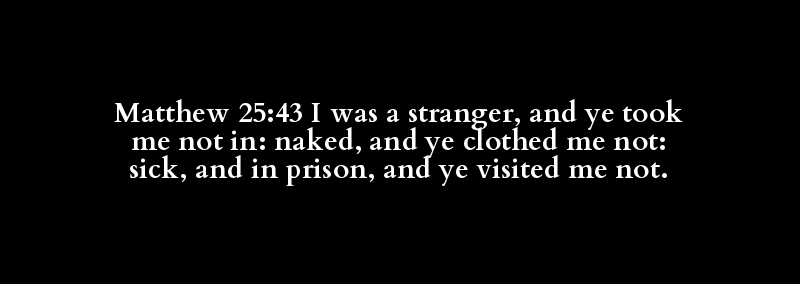 Matthew 25:43 I was a stranger, and ye took me not in: naked, and ye clothed me not: sick, and in prison, and ye visited me not.