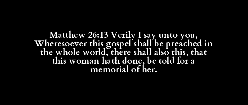 Matthew 26:13 Verily I say unto you, Wheresoever this gospel shall be preached in the whole world, there shall also this, that this woman hath done, be told for a memorial of her.