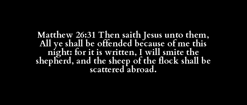 Matthew 26:31 Then saith Jesus unto them, All ye shall be offended because of me this night: for it is written, I will smite the shepherd, and the sheep of the flock shall be scattered abroad.