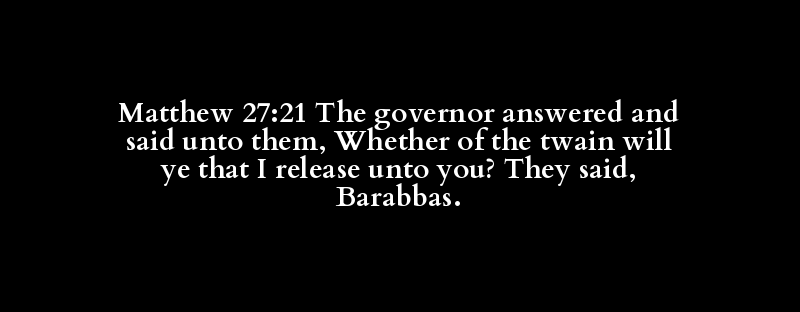 Matthew 27:21 The governor answered and said unto them, Whether of the twain will ye that I release unto you? They said, Barabbas.
