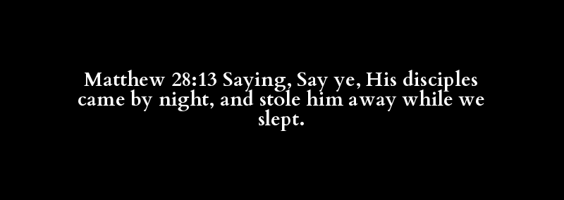 Matthew 28:13 Saying, Say ye, His disciples came by night, and stole him away while we slept.