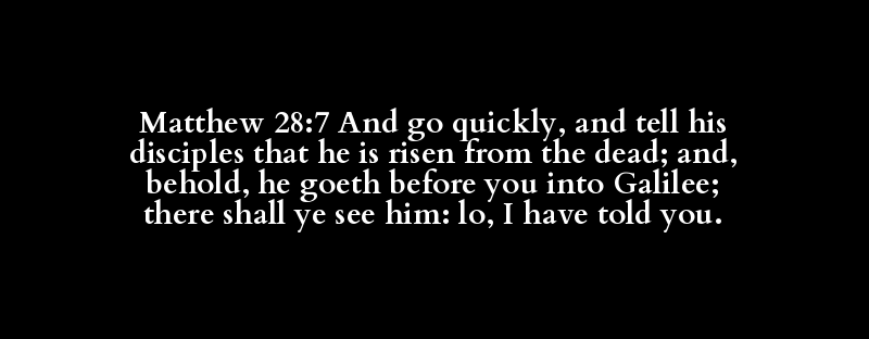 Matthew 28:7 And go quickly, and tell his disciples that he is risen from the dead; and, behold, he goeth before you into Galilee; there shall ye see him: lo, I have told you.