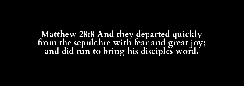 Matthew 28:8 And they departed quickly from the sepulchre with fear and great joy; and did run to bring his disciples word.