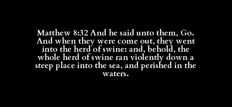 Matthew 8:32 And he said unto them, Go. And when they were come out, they went into the herd of swine: and, behold, the whole herd of swine ran violently down a steep place into the sea, and perished in the waters.