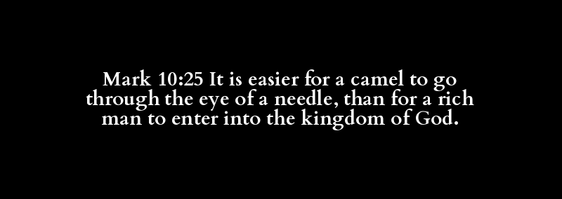 Mark 10:25 It is easier for a camel to go through the eye of a needle, than for a rich man to enter into the kingdom of God.