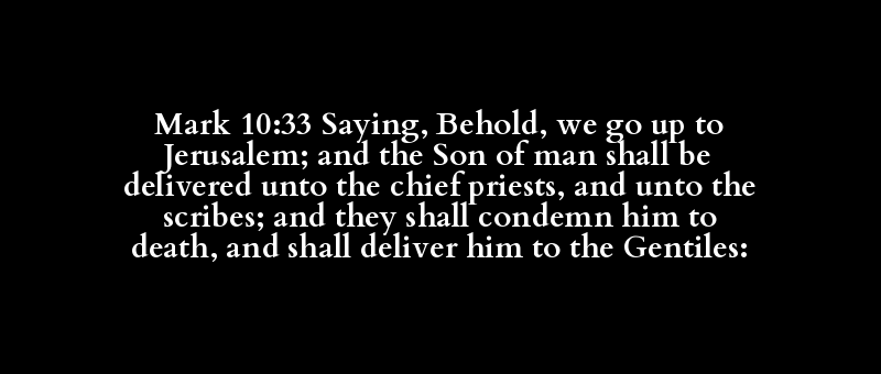 Mark 10:33 Saying, Behold, we go up to Jerusalem; and the Son of man shall be delivered unto the chief priests, and unto the scribes; and they shall condemn him to death, and shall deliver him to the Gentiles: