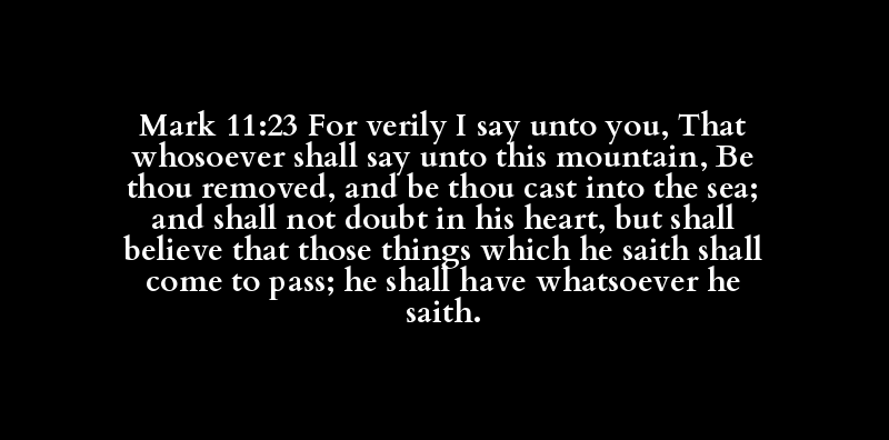 Mark 11:23 For verily I say unto you, That whosoever shall say unto this mountain, Be thou removed, and be thou cast into the sea; and shall not doubt in his heart, but shall believe that those things which he saith shall come to pass; he shall have whatsoever he saith.