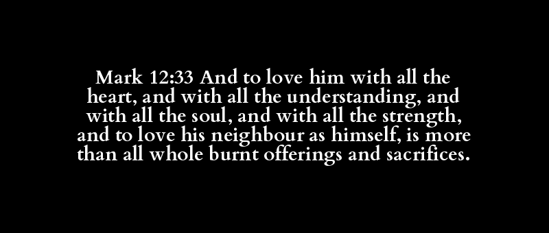 Mark 12:33 And to love him with all the heart, and with all the understanding, and with all the soul, and with all the strength, and to love his neighbour as himself, is more than all whole burnt offerings and sacrifices.