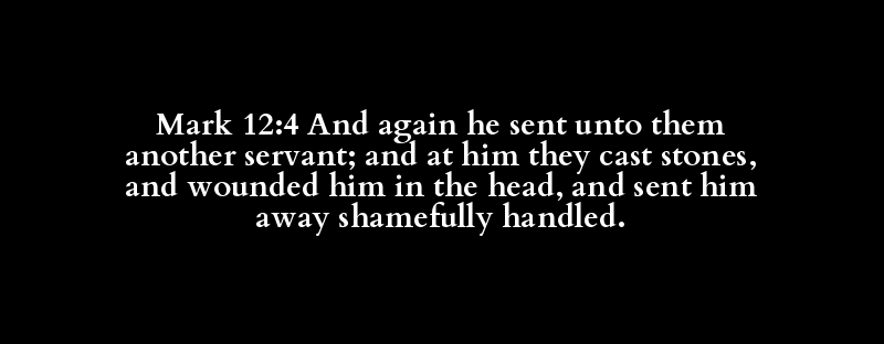 Mark 12:4 And again he sent unto them another servant; and at him they cast stones, and wounded him in the head, and sent him away shamefully handled.