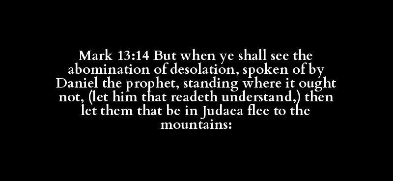 Mark 13:14 But when ye shall see the abomination of desolation, spoken of by Daniel the prophet, standing where it ought not, (let him that readeth understand,) then let them that be in Judaea flee to the mountains: