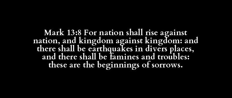 Mark 13:8 For nation shall rise against nation, and kingdom against kingdom: and there shall be earthquakes in divers places, and there shall be famines and troubles: these are the beginnings of sorrows.