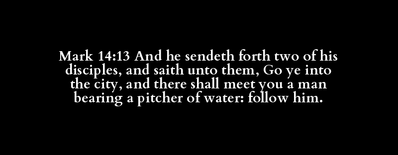 Mark 14:13 And he sendeth forth two of his disciples, and saith unto them, Go ye into the city, and there shall meet you a man bearing a pitcher of water: follow him.