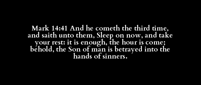 Mark 14:41 And he cometh the third time, and saith unto them, Sleep on now, and take your rest: it is enough, the hour is come; behold, the Son of man is betrayed into the hands of sinners.